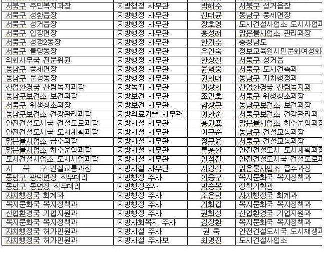 이는 지방행정연수원 고급리더과정(4급)·중견리더과정(5급) 교육훈련 파견과 명예퇴직 등 후속 및 조직개편에 따른 허가민원과 신설 등에 대한 인사단행이라고 설명했다.