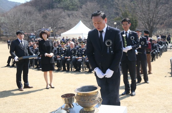 구본영 천안시장이 천안함 46용사 5주기 추모식에서 추모를 하고 있는 모습 [사진=천안시]