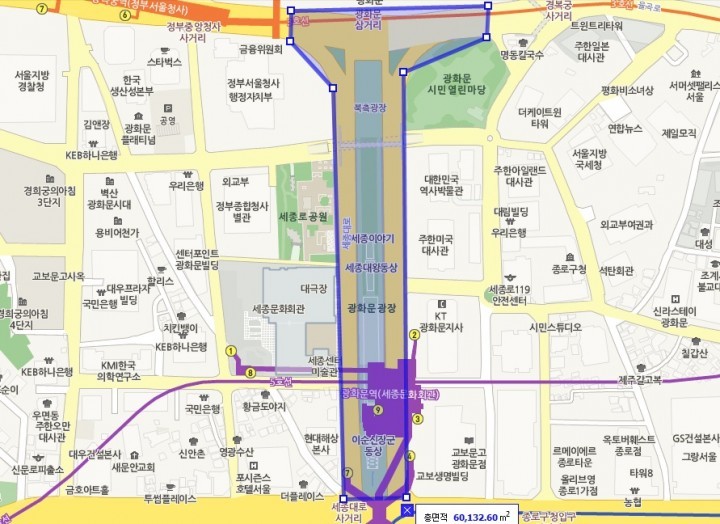 광화문 광장의 넓이가 약60,132㎡정도로 보면 60,132 × 6 = 360,792 명이다. 광화문에 설치된 시설물이 차지하는 공간은 계산하지 않고 비어 있는 것으로 보고 계산 한 것이다.