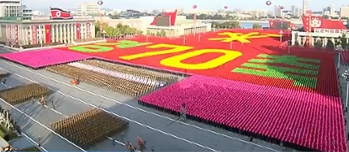 다음사진은 북한 김정은 열병식에서 약10만 명 정도로 질서 정렬하게 있을 때 이다.