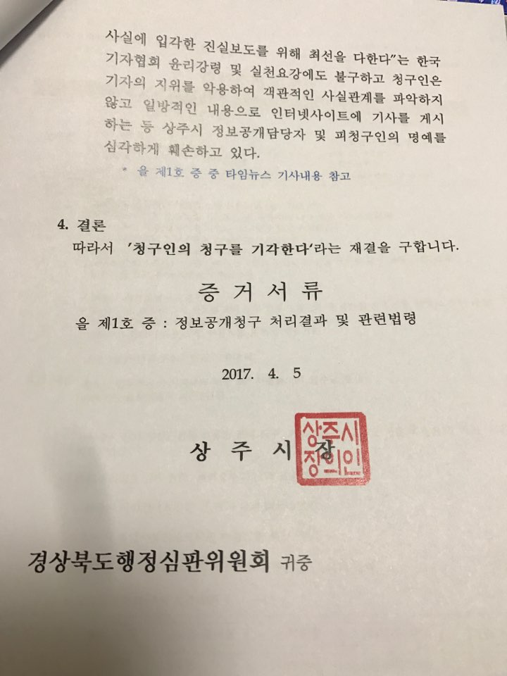 본지에서 사실 근거 없이 보도된 내용이 있으면 언론중재위원회에 재소 하면 될 것을 행정심판 답변서에 ‘기자의 지위를 이용했다는 등의’ “공식적인 문서에 단어를 적시하는 공직자의 자질보다 “ 이정백 상주시장의 직인이 찍힌 것이 더욱더 한심스럽게 느끼는 것은 왜일까?