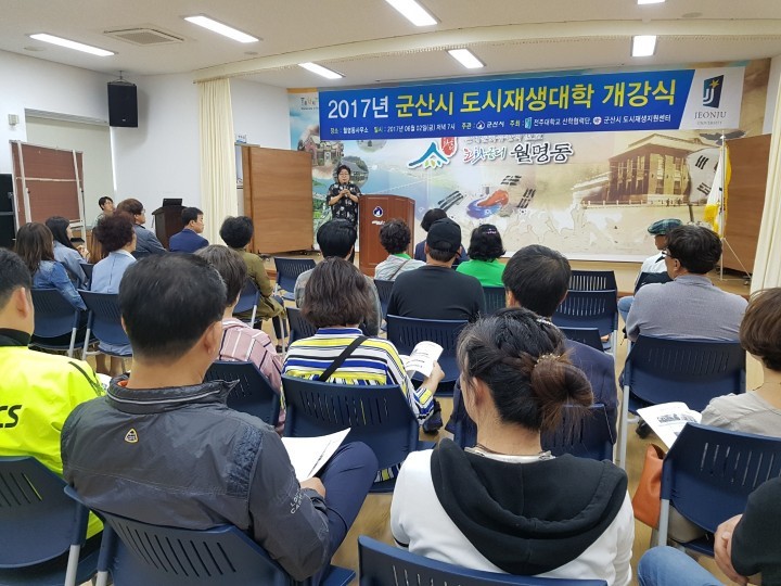군산시는 지난 2일 월명동 주민센터에서 도시재생대학 수강생 등 60여 명이 참석한 가운데 17년도 하반기 도시재생대학 개강식 및 오리엔테이션을 실시했습니다.