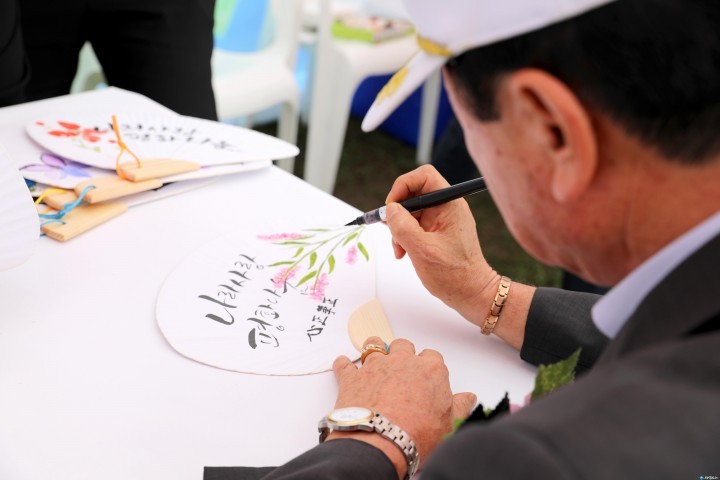 부채 만들기 부스에서는 무공수훈자회 회원이 ‘心正筆正(마음이 바르면 글도 바르다)’을 쓰며 “바른 마음이 기본이 되면 행동도 바르다”며 행사를 기획한 봉사단을 칭찬하기도 했다.