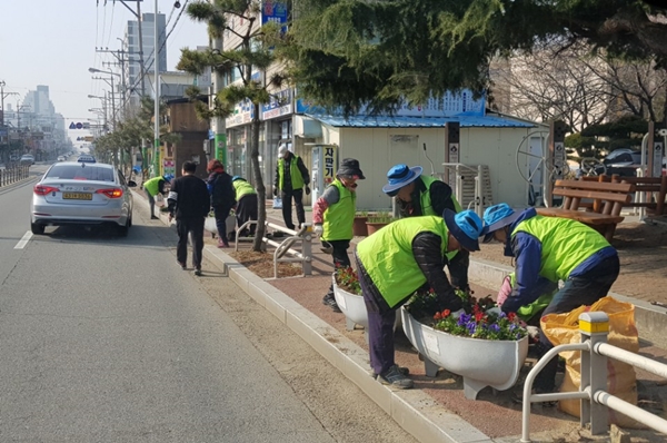 월명동은 지난 23일 직원과 노인공익사업 근무자 30여 명이 참여한 가운데 원도심의 주요 도로인 월명로(명산사거리~ 미원사거리)와 중앙사거리 일대에 팬지꽃 2300여 본을 심어 봄맞이 가로환경 정비를 실시했다. 27일 흥남동도 직원 및 노인일자리 참여자 등 30여 명이 참여해 원도심의 주요 관문인 흥남사거리~미원사거리와 미원사거리~구역전사거리 일대에 봄꽃 팬지를 식재했다.