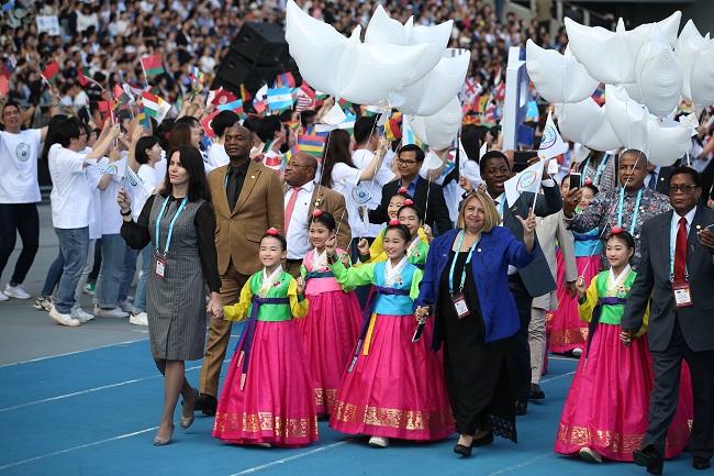 이만희 대표의 ‘평화의 북소리’로 출발한 평화 파도타기와 310명의 군악대 퍼포먼스가 이날 기념식의 화려한 시작을 알렸다. 이 퍼포먼스는 평화의 북소리와 일곱 나팔소리를 통해 평화에 대해 잠자고 있는 지구촌을 깨우고 평화의 마음을 갖게 하기 위함을 나타냈다. 이어 펼쳐진 세계평화 퍼레이드는 2500명의 HWPL 전국 12지부 회원들이 평화를 바라는 마음으로 모여 아름다운 평화의 세계로 변해가는 지구촌을 그려내 장관을 이뤘다. ‘영원한 평화의 세계로!’라는 제목으로 준비된 퍼레이드는 12가지 주제로 평화를 이룰 수 있는 답을 제시했다는 평을 받았다. 거대한 해, 달, 별과 천하 만물 형상들이 등장한 HWPL서울경기남부지부의 첫 퍼레이드는 ‘지구촌에 하늘문화, 영원한 평화 낙원’을 표현했으며 수많은 형형색색의 나팔형상이 등장한 부산경남동부지부는 ‘평화의 나팔! 새 시대를 알리다!’는 주제를 나타냈다. 대북소리가 행사장 전체를 뒤흔든 인천지부는 ‘생명의 빛, 평화의 중심! HWPL’이란 주제로 HWPL의 역동성을 표현했다. 이어 서울경기북부지부는 ‘하나된 36억 여성, 꽃피운 평화’란 주제로 HWPL의 협력단체인 세계여성평화그룹(IWPG)의 평화활동을 소개했다. 서울경기서부지부는 ‘IPYG의 힘찬 평화의 외침’이란 주제로 HWPL의 산하단체인 국제청년평화그룹(IPYG)의 평화 촉구 외침을 담아냈으며 서울경기동부지부는 ‘평화의 선물 전하는 여정’이라는 주제로 29차례에 달하는 HWPL 평화사절단의 해외 순방 활동을 표현해냈다. 전북지부는 ‘마음으로 하나된 종교세상’이란 주제로 전쟁의 주요원인이 되고 있는 종교가 하나로 통합되길 기원했다. 강원지부는 ‘후대에게 전할 최고의 선물, 평화교육’이란 주제로 HWPL이 진행하는 평화교육을 통해 하나로 화합된 지구촌을 화려하게 나타냈다. 대구경북지부는 ‘전쟁종식의 해답 DPCW!’란 주제를 형상화해 각 국 대통령이 DPCW(지구촌 전쟁종식 평화 선언문)를 법제화하는데 동의해 줄 것을 호소했다. 광주전남지부는 ‘철마는 달리고 싶다’는 주제로 전쟁과 갈등으로 끊어진 길이 DPCW로 연결됨을 알렸다. 부산경남서부지부는 ‘하늘문화 전파로 하나된 지구촌 평화 가족’이란 주제로 각 종교와 세계 각 국의 대형 랜드마크를 등장시켜 하나된 지구촌을 상징화했다. 마지막으로 대전충청지부는 ‘하나님이 통치하시는 평화의 세계-낙원의 세계, 평화대축제’라는 주제로 평화낙원의 세상을 화려하게 형상화해냈다. ◆ ‘한반도 평화의 빛, 전 세계를 밝히다’…평화로 We are one(우리는 하나)! 이 대표의 기념사 및 귀빈들의 환영사 후 400여명의 무용수들이 펼치는 예술 공연과 불꽃 축제, 모두가 하나 되어 어우러지는 대동제가 이어져 가을밤을 화려하게 수놓았다. ‘한반도 평화의 빛, 전 세계를 밝히다’라는 주제로 선보인 예술공연은 빛의 태동으로 시작해 화합과 조화를 이루어 영원한 평화로 나아가는 과정을 그려냈다. 또한 매년 기념식에서 참여한 모든 이들에게 감동과 감탄을 자아냈던 대동제는 평화를 소망하는 전 세계인이 국경·인종·종교를 초월해 하나가 되어 그 기쁨을 표현하는 축제의 장이 됐다. 화려한 불꽃이 밤하늘을 수놓는 가운데 행사장은 완전한 평화의 세상이 이뤄진 세상을 보는 것처럼 참가자들은 서로 어깨춤을 추며 즐거움을 표현했다. 이번 ‘9·18 평화 만국회의 4주년 기념식’ 문화공연을 기획한 관계자는 “지금까지 이어져 온 전쟁과 죽음의 문화에서 평화와 생명의 문화로의 변화를 표현하고자 했다. 평화와 생명의 시대를 눈과 귀로 경험하면서, 평화의 씨앗이 참석자들의 마음에 심겨 모두를 평화의 사자로 만들고자 하는 것이 핵심"이라며 “이번 4주년 행사에서도 세계 시민들에게 뜨거운 감동을 줄 것"이라고 말했다.
