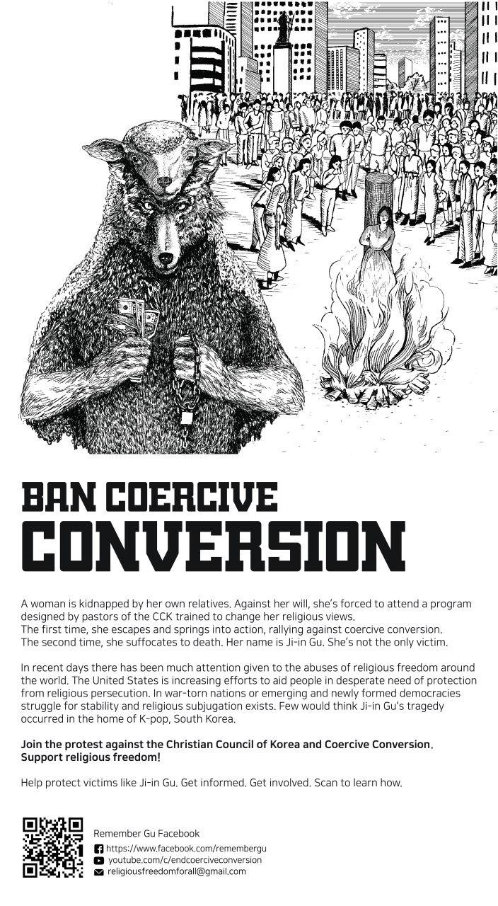 28일자(현지시간) 뉴욕타임즈에 따르면 한 여성(고 구지인 씨)이 한기총(한국기독교총연합회) 목사들이 종교적 관점을 바꾸기 위해 만들어낸 프로그램에 의해 납치됐다. 첫 납치 때 탈출해 강제개종 반대집회까지 참가했던 그녀는 두 번 째 납치됐을 때 질식사하고 만다. 이어 뉴욕타임즈는 전 세계가 종교의 자유 침해에 주목하고 있으며 종교박해로부터 보호받아야 할 사람들을 돕기 위한 노력들이 증가하고 있다고 강조했다. 특히 이 신문은 전시국가나 신흥 국가들에서 종교탄압이 일어나기도 하지만 케이팝(K-Pop)의 고향인 대한민국에서 강제개종에 의한 살인이 발생했다고 생각할 사람은 없을 것이라며 한기총과 강제개종에 대항하는 시위를 도울 것과 구지인 씨와 같은 희생자들의 보호에 관심을 가지고 동참해줄 것을 호소했다. 광고 후원에 참여한 기진명 한국외국인인권보호법률위원회 광주·전남지부 인권국장은 “뉴욕의 한 시민이 강제 개종 사망사건을 접한 후 Go Fund Me 사이트를 통해 모금운동을 시작했고, 저도 동참하게 됐다."며 “구지인 씨 사망 1주기를 앞두고도 강제 개종은 여전히 기승을 부리고 있다. 광고를 통해 한국의 강제 개종 실태가 전 세계에 알려지길 바란다"고 말했다.