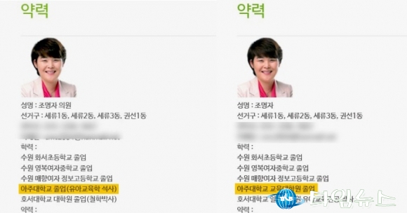 먼저 조의장은 공식 선거운동이 시작되기도 전에 이미 시의회 홈페이지 프로필에 학력을 ‘아주대학교 졸업(유아교육학 석사)’으로 표시했다.