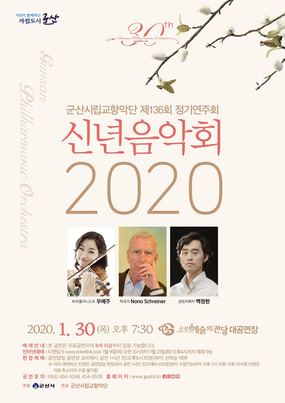 신년음악회는 창단 30주년을 맞이한 군산시립교향악단이 새해를 맞는 시민 여러분들에게 정통클래식의 다양한 변모의 모습을 보여드릴 예정이며, 백정현 상임지휘자의 지휘 아래, 비르투오스 바이올리니스트 우예주가 함께 무대에 오른다.