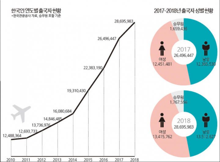 해외여행 자유화 조치로 우리보다 25년이나 앞선 일본과도 차별화 된다. 일본의 인구는 1억2천700만명으로 우리보다 2.2배가 높은데도 불구하고, 2018년 일본 정부 관광국(JNTO)은 일본 내국인 출국자 수 1,895만명으로 발표했다. 우리가 일본보다 1,000만명 이상 높은 출국율을 보인다.
