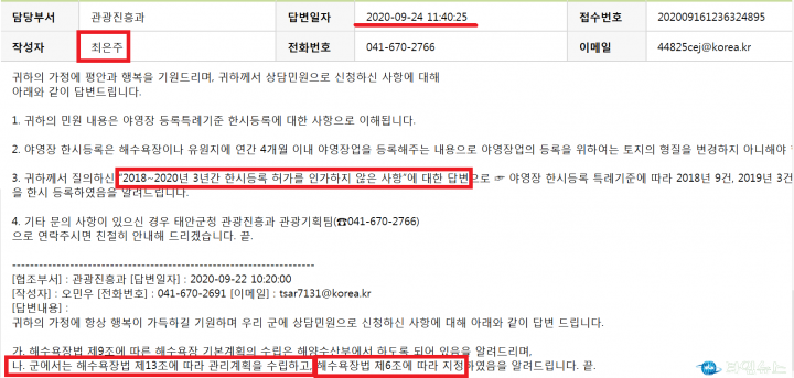달라진 개정안이 없음에도 ‘해수욕장 지정고시 지역’ 기치를 높이 들고 ‘조건부 기간제 한시등록’ 을 관철시킨 공직자와, 2020년 불특정 다수의 적발 및 고발 건 관련 답변을 건의하자 “법률을 준수했으며 태안군 책임은 없다" 고 주장한 공직자와 다른 점이 무엇일까.