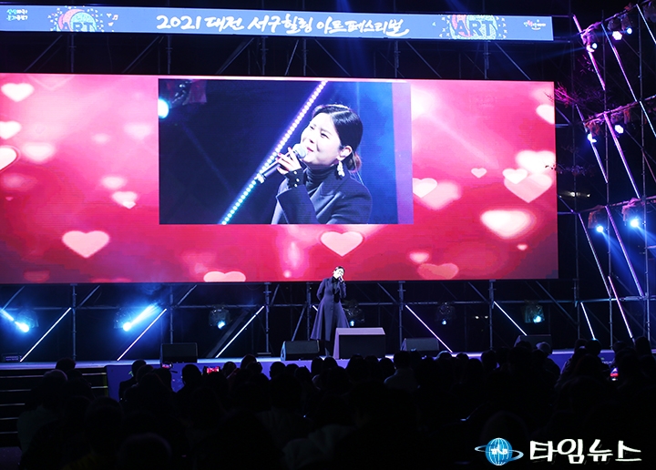 [대전타임뉴스=홍대인 기자] ‘2021 대전 서구힐링 아트페스티벌’이 서구청 앞 보라매공원에서 19일 개막한 가운데 가수 ‘린’이 축하 공연을 하고 있다. 올해로 다섯 번째를 맞는 서구힐링 아트페스티벌은 ‘상상자극! 문화공감!’을 주제로, 도심 속 공원에서 지역의 문화예술 인프라를 활용해 지역민과 예술가가 함께하는 참여형 예술축제다. 보라매공원에 조성한 ‘아트빛터널’은 서구의 가을과 겨울을 주제로 하여 음악과 풍경이 함께하는 460m 구간의 테마별 빛터널로 다음 달 26일까지 운영되며, 형형색색의 LED 조명으로 연출하는 환상적인 빛의 향연이 관람객들에게 즐거운 추억을 선사하고 있다. 축제의 대표프로그램인 아트마켓은 60개의 부스에서 예술작가들이 관람객과 소통하며 회화와 공예 등 수준 높은 작품을 전시·판매한다. 또한 트릭아트, 미술심리치료, 버블아트, 샌드아트 등 온 가족이 함께 즐길 수 있는 다양한 체험프로그램이 관람객을 맞이하고 있다.