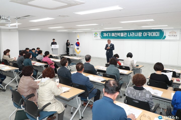 [예천타임뉴스=남재선 기자]예천군(군수 김학동)은 19일 오후 2시 예천박물관에서 ‘제4기 나라사랑 아카데미’ 개강식을 개최했다. 2021년부터 진행된 나라사랑 아카데미는 다양한 주제로 강의와 현장 교육을 진행하고 특히, 교수 등 전문가를 초청하여 수준 높은 교육과정으로 큰 호응을 얻고 있으며 현재까지 총 90명의 수료자를 배출했다. 이번 아카데미는 지역민 30명을 대상으로 6월 21일까지 임진왜란과 약포정탁‧예천의 동학‧예천의 개화기 인물‧예천의 독립운동을 주제로 한 강의와 울릉도·독도 현장답사 등 총 10회 진행된다.