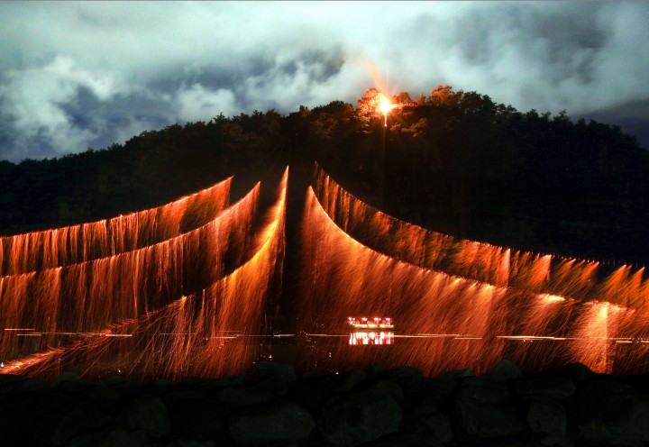 ‘낙화야’함성과 함께 70m 부용대 정상에서 떨어지는 불덩이가 부용대 절벽에 부딪혀 사방으로 흩어지고, 강물 위에서는 달걀 껍데기 속에 기름을 묻힌 솜을 넣고 불을 붙인 수백 개의 달걀 불이 떠다니는‘연화’ 또한 몽환적 감명을 전한다. 유유히 흐르는 낙동강, 병풍처럼 펼쳐진 부용대 절벽을 배경으로 밤하늘을 수놓는 화려한 낙화놀이는 탄성과 환호성을 자아낸다.