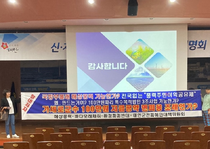 당일 배포된 브로셔 ▶ 행사 명칭은 '집적화단지 주민 사업 설명회' ▶ 슬러건(slogan)은 ‘세계를 대표하는 한국형 대규모 해상풍력 도시 조성’ ▶ 추진동기는 ‘태안화력 1-6호기 폐지로 인한 세입 170억원 감소 및 화력직원과 그 가족을 포함해 3,000여 명의 인구 유출이 우려되는 상황이기에 대체 에너지와 새로운 산업 발굴’ 등으로 요약한다면 '화력발전이 폐쇄되면서 170억원 세수감소가 예정되며 삼천명 탈태안 유출까지 추측되니 이들을 위해 풍력 산업단지를 만들어 세계적인 도시를 만들자' 는주장으로 해석된다. 직역하면 어민의 생업터전을 빼앗아 170억 세수를 확보하고, 터잔을 잃은 화력발전 가족도 챙기면서 1600여 군청 직원 포함 전군민 100원 씩 배분하자는 주장으로 해석된다. 어민의 어장만 약탈해 잘먹고 잘 살아보자는 사업으로 추측된다.