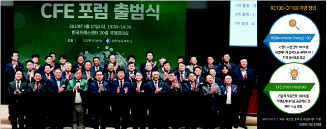 대기업 등 경제계도 나섰다. 올 5월, 산업자원통상자원부는 대한상공회의소와 함께 'CFE포럼 출범식' 도 했다. CF100 인증 및 법령 제정의 보조역할을 맡은 이들은 발빠른 행보를 보였다. 4개월 뒤 있을 윤석열 대통령의 무탄소에너지 국제확산을 위한 플렛폼 ’무탄소 연합(Carbon Free Alliance)‘ 결성 선언. 이를 위해 국가간 긴밀한 공조도 한몫 했다.(23. 09.18. 제78차 UN총회 윤석열 대통령 기조연설 참조)