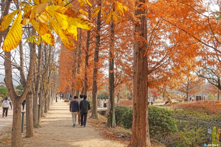 [경주타임뉴스=전찬익기자] ‘사계절이 뚜렷한 기후’라는 지리책 속의 한반도 기후 설명이 무색하다는 느낌이다. 안 그래도 짧은 가을인데 이제는 정말 스치듯 지나는 계절이 되는 듯 해 아쉬움이 진해진다.긴 여름, 긴 겨울로 우리의 계절 달력이 지배당하기 전에 찰나의 가을을 영원한 기억으로 남겨 보자.가을에 경주를 찾는다면 꼭 가보아야 할 단풍 명소 9곳을 꼽아 보았다.#1. 경북산림환경연구원연구원을 지나는 도로인 통일로를 기준으로 서쪽 영역과 동쪽 영역이 있는데 서쪽 영역에는 연구원 본관과 피크닉 쉼터, 숲 산책로 등이 자리한다.이곳의 하이라이트는 단연 동쪽 영역이다. 연구를 위한 목적으로 다양한 수목과 화초를 식재해 관리하면서 이를 일반에 공개하던 곳이었는데 이곳이 ‘천년 숲 정원’이라는 이름으로 우리에게 돌아왔다.입구로 들어서면 체험 정원과 가든 센터가 먼저 보이고, 이어서 테마가 있는 소정원과 숲길, 신라의 역사가 녹아든 쉼터 등을 다채롭게 만날 수 있다.그중 포토스팟으로 유명한 외나무다리는 습지원, 일명 거울숲에서 찾을 수 있다. 가을에 특히 아름다운 포인트를 꼽으라면 메타세쿼이아 숲길과 마로니에라고도 부르는 칠엽수 숲길이다.#2. 서면 도리마을한적한 농촌마을이었던 이곳이 어느덧 경주 가을 대표 명소가 됐다. 묘목 용도로 나무를 밀도 있게 식재한 덕에 은행나무가 양 옆으로 퍼지지 않고 마치 자작나무처럼 위로 쭉 뻗은 늘씬한 모양으로 자랐다.그래서 도리마을 은행나무 숲으로 들어가면 외국의 어느 숲에 와 있는 듯 이국적인 분위기가 느껴진다.은행나무가 노랗게 물들 때 이곳의 풍경은 환상 그 자체다. 절정 시기를 살짝 지나 나뭇잎이 모두 떨어지고 땅 위에 샛노란 양탄자가 깔린 모습 또한 절세비경이다.은행나무 숲 외에 도리마을 내에 포토제닉한 벽화들이 그려져 있어 볼거리를 더해주고, 은행나무 물드는 시기에는 주민들이 마을 회관 앞에서 먹거리 장터, 특산물 장터를 운영해 즐길 거리도 더한다.#3. 통일전 은행나무길통일전 영역 내에는 소담한 연못과 정자 화랑정이 있다. 또 갖가지 수목으로 아름답게 조경을 해 여유롭게 산책하며 둘러보기 좋다. 단풍나무가 많아 가을에 특히 아름답다. 통일전과 함께 은행나무 길도 꼭 감상해야 할 주요 포인트이다.10월 말부터 11월 초까지 통일전 앞으로 쭉 뻗은 약 2km의 도로 양옆 은행나무가 아름답게 물들어 걷고 싶은 길, 드라이브하고 싶은 도로로 만들어 준다.#4. 무장봉 억새군락함월산, 운제산과 이웃하고 있는 무장봉은 억새 장관으로 유명세를 타는 곳이다. 이 일대는 1970년대 소들이 한가로이 풀을 뜯는 목장이었다. 목장이 문을 닫으면서 초지에 억새가 자생하기 시작했다. 해발고도 624m의 산 정상부까지 올라야 만날 수 있는 장관이지만, 땀 흘린 뒤에 얻는 절경은 100% 이상의 만족으로 돌아온다.탐방 안내소에서 정상의 억새군락까지 다녀오는 데 넉넉하게 반나절 정도의 시간을 계획하면 무리 없다.올라가는 길에 삼국통일 후 문무왕이 무기를 묻었다고 전하는 무장사의 터가 있고 삼층석탑이 남아 있으니 함께 들러서 가자.#5. 운곡서원운곡서원은 안동 권씨의 시조인 권행과 조선시대 참판을 지낸 권산해, 군수 권덕린을 기리기 위해 건립된 곳이다. 이곳의 가을 포토스팟은 서원 바깥에 있다. 서원 바깥 영역에 유연정이라는 별도의 정자가 있는데 그 앞에 아름드리 은행나무 한 그루가 서 있다.수령이 400년에 달하는 거대한 은행나무로 나무줄기에서 뻗어 나온 무수한 가지에 샛노란 은행잎이 춤을 춘다. 은행나무와 정자 유연정을 함께 담으면 황홀한 풍광을 남길 수 있다.#6. 불국사불국사는 신라 경덕왕 때의 재상이었던 김대성이 짓기 시작해 혜공왕 때에 완성한 사찰이다.불국사는 신라인의 우수한 건축 기술과 예술성을 보여 주는 걸작으로 평가받는다. 불국사와 다보탑, 청운교와 백운교, 연화교와 칠보교, 금동비로자나불좌상 등 국보가 가득하니 구석구석 찬찬히 불국사를 둘러볼 것을 추천한다.불국사를 기억하는 또 하나의 방법. 단풍이 물드는 가을에 불국사에 방문해 보는 것이다.불국사 가람 외부와 내부의 정원에는 단풍나무가 많이 식재돼 있다. 새빨갛게 물드는 단풍과 세계문화유산을 함께 담아 보자.#7. 경주 계림계림은 원래 성스러운 숲이란 뜻의 ‘시림’으로 불렸는데, 닭과 관련된 김알지의 탄생 설화 때문에 닭이 우는 숲이란 뜻의 계림으로 불리게 됐다.이 천년의 숲에는 물푸레나무, 홰나무, 단풍나무 등 수령 지긋한 고목이 울창한 숲을 이룬다. 단풍이 물드는 가을에 특히 아름다움을 더한다. 숲 사이로 산책로가 내어져 있어 붉게 물든 단풍나무 아래에서 사색의 가을 산책을 즐기기 좋다.#8. 용담정용담정은 최제우 선생이 포교를 하고 용담유사를 쓴 정자로 정자와 함께 수도원 시설 등이 들어서 있다. 용담정과 멀지 않은 곳에 최제우 유허비가 있고 그 자리에 선생의 생가가 복원돼 있으니 함께 둘러보기 좋다. 이 일대는 동학의 발상지로 성역화 사업이 진행되고 있다.최근에는 기념관 건립이 완공돼 새롭게 문을 열기도 했다. 의미 깊은 동학 성지 용담정