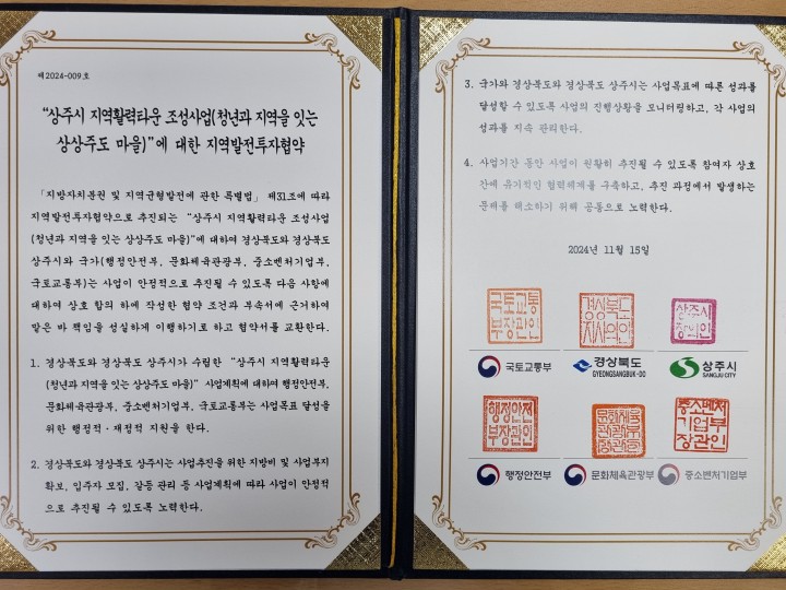 [상주타임뉴스 이승근 기자]상주시는 국토교통부, 행정안전부, 문화체육관광부, 중소벤처기업부와 협력해 지역활력타운 추진을 위한 지역발전투자 협약을 체결했다고 20일 발표했다.