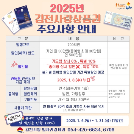 2025년에는 총 700억 원 규모로 발행될 김천사랑상품권은 카드형 상품권의 상시 할인율 6%와 함께 분기별 1회 특별할인 10%로 운영된다. 단, 개인별 구매 한도는 월 50만 원, 연 500만 원으로 유지된다.