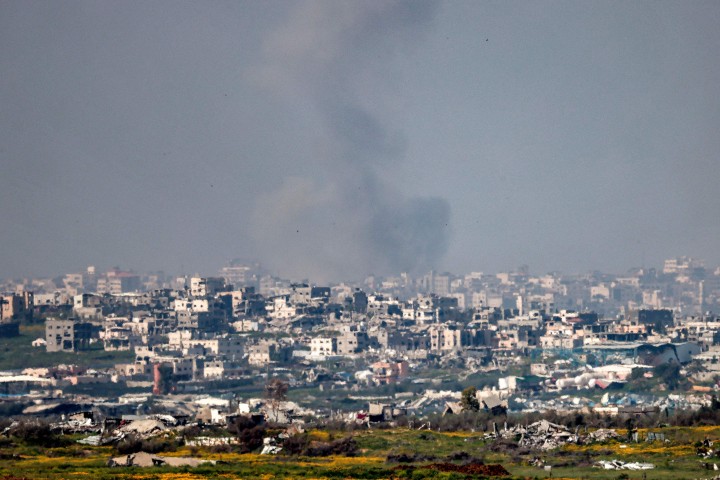 [가자지구 북부의 파괴된 건물에서 연기가 솟아오르고 있다].