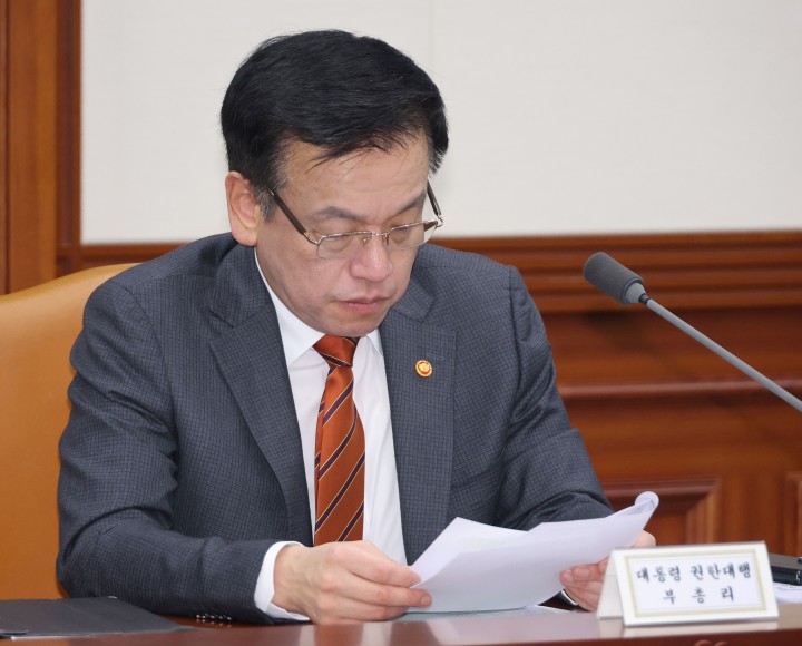 최상목 대통령 권한대행 부총리 겸 기획재정부 장관이 19일 정부서울청사에서 국정현안관계장관회의 겸 경제관계장관회의 겸 산업경쟁력강화관계장관 회의 자료를 보고 있다. 2025.3.19
