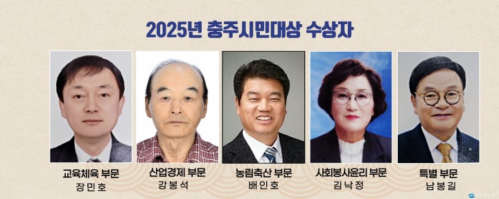 [충주타임뉴스=한정순 기자] 충주시는 지역사회 발전에 공헌한 시민을 선정하는 ‘2025년 충주시민대상’ 수상자를 발표했다고 19일 밝혔다. 이번 수상자는 공적심사위원회의 심사를 거쳐 총 5명으로, 각 부문에서 지역 발전과 시민 행복을 위해 헌신한 시민들이 선정됐다.