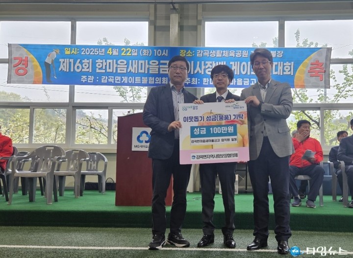 [음성타임뉴스=한정순 기자] 감곡한마음새마을금고(이사장 김태형)는 22일 제16회 이사장배 게이트볼대회를 맞아 복지사각지대에 놓인 이웃들을 위한 성금 100만 원을 감곡면지역사회보장협의체에 기탁했다. 이번 성금은 지난 4일과 5일 열린 감곡 주민자치회 주최 청미천 벚꽃축제 플리마켓 행사에 참여해 얻은 수익금 전액으로 마련됐다. 금고는 지역 축제에 적극 동참하는 한편, 그 수익을 기부해 지역사회 나눔에 앞장섰다. 김태형 이사장은 “지역 주민들과 함께한 뜻깊은 행사에서 얻은 수익을 다시 이웃들에게 환원할 수 있어 보람을 느낀다"며 “앞으로도 지역과 상생하는 따뜻한 금융기관이 되겠다"고 했다. 최병원 감곡면장(감곡면지역사회보장협의체 공공위원장)은 “소외된 이웃들을 위한 나눔에 앞장서 주신 한마음새마을금고에 감사드리며, 기탁 성금은 복지사각지대 해소를 위한 맞춤형 사업에 소중히 사용하겠다"고 전했다. 한편 감곡한마음새마을금고는 평소에도 사랑의 반찬 나눔, 떡국 나눔 행사 등 다양한 봉사활동을 통해 지역 내 이웃사랑을 실천하고 있다.