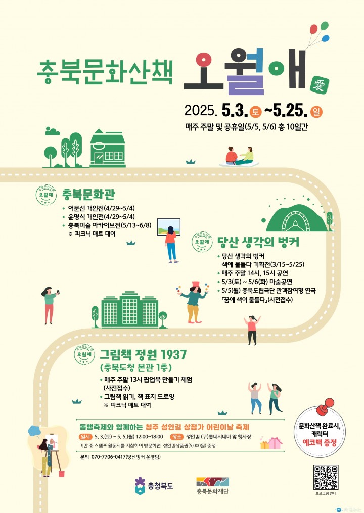 충청북도 관계자는 “이번 ‘오월애’ 행사는 도심 속 문화공간을 하나의 산책 코스로 연결해 문화예술을 일상 속에서 향유할 수 있는 특별한 기회를 제공하고자 기획됐다”며 “시민들에게 봄의 정취와 함께하는 풍성한 문화 체험이 되기를 기대한다”고 전했다.