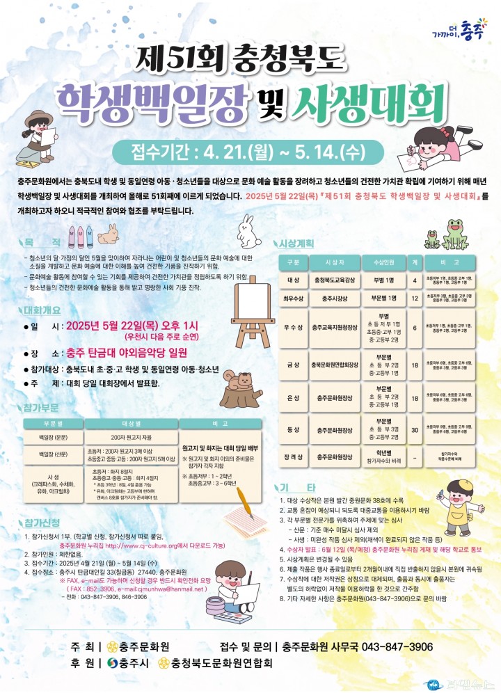 대회와 관련한 자세한 사항은 충주문화원(043-847-3906)으로 문의하면 된다.