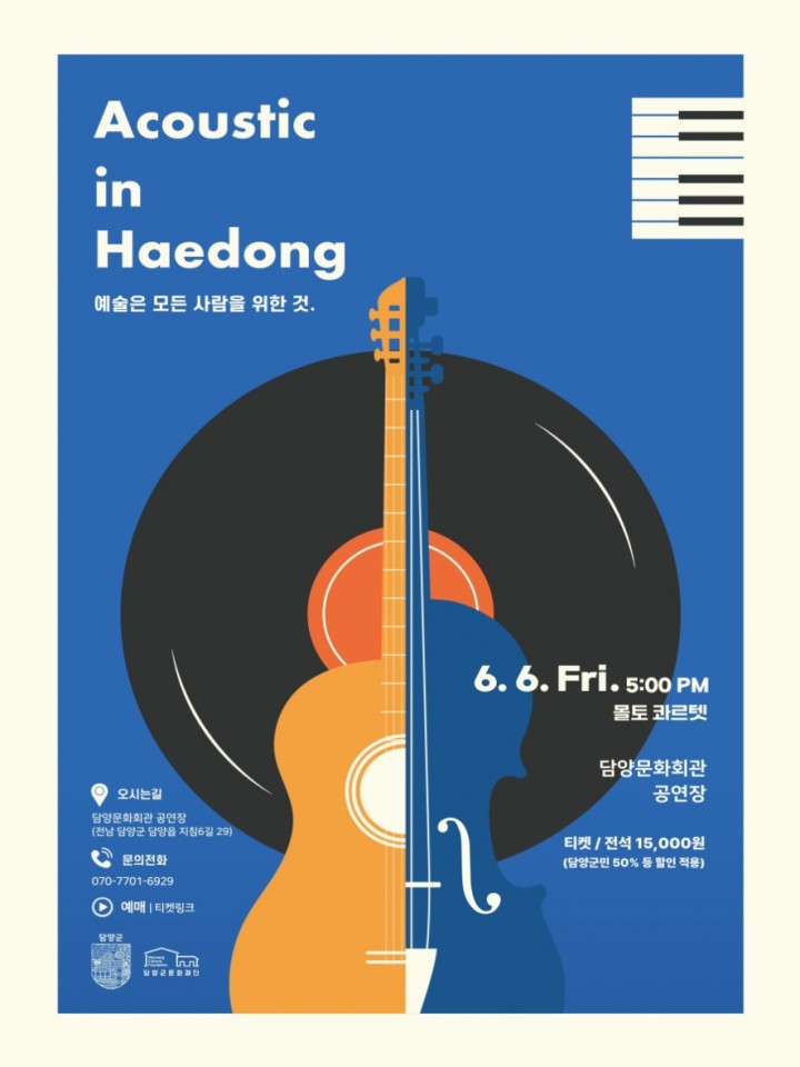 ▲어쿠스틱 인 해동 포스터.(사진제공=담양군)[담양타임뉴스] 오현미 기자 = (재)담양군문화재단(이하 재단)은 오는 6월 6일 오후 5시, 담양문화회관 공연장에서 ‘어쿠스틱 인 해동’ 공연을 연다고 밝혔다.