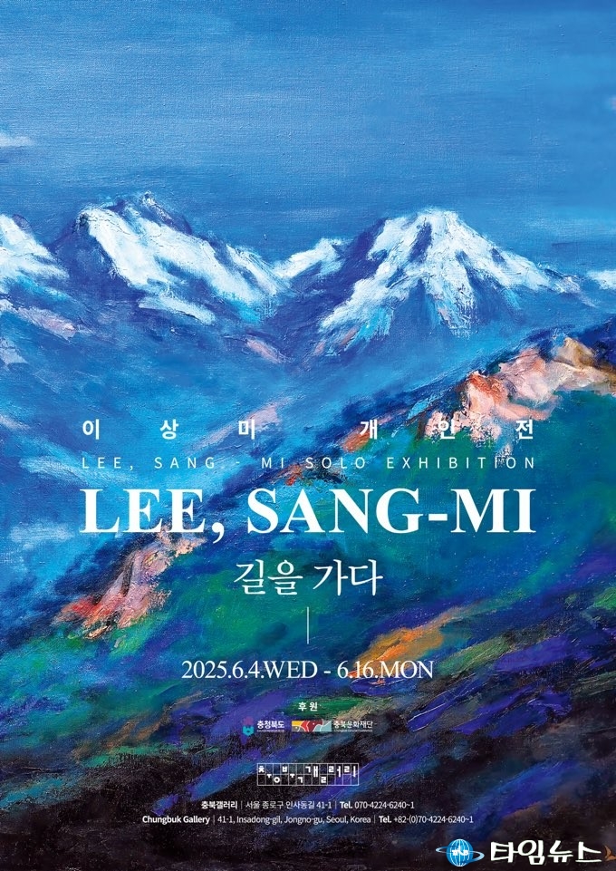 [충북타임뉴스=한정순 기자] 충청북도(도지사 김영환)와 충북문화재단(대표이사 김갑수)은 오는 6월 4일(수)부터 16일(월)까지 서울 인사아트센터 2층 충북갤러리에서 이상미 작가의 개인전 《길을 가다》를 개최한다고 밝혔다.