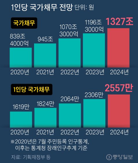 [2024년 국가채무 국민 1인당 2557만원 추가 납세]=기획재정부= 중앙일보 제공