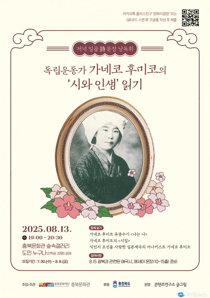 이번 8월 낭독회의 주제는 ‘독립운동가 가네코 후미코의 시와 인생 읽기’로, 일제강점기 조선을 사랑하며 저항했던 일본 출신 아나키스트이자 시인 가네코 후미코의 삶과 문학세계를 재조명하는 뜻깊은 시간이 될 예정이다. 참여자들은 그녀의 옥중 수기 『나는 나』, 『가네코 후미코 시집』, 평전 『식민지 조선을 사랑한 일본제국의 아나키스트 가네코 후미코』 등을 낭독하며, 시인의 내면과 시대정신을 함께 되새기게 된다. 행사는 창작·출판 연구팀 ‘콘텐츠연구소 글 그림’ 유영선 대표의 해설과 낭독으로 깊이를 더할 예정이며, 참여자들도 각자 준비한 애국시나 에세이 문장을 나누는 시간도 마련되어 있다. 충북문화재단 관계자는 “광복 80주년이라는 역사적 의미를 문학을 통해 조명하고, 도민들이 함께 기억하고 사유하는 시간이 되길 바란다"며 “독서와 낭독에 관심 있는 분들의 많은 참여를 기대한다"고 전했다. 이번 프로그램은 7월 30일(수)부터 8월 8일(금)까지 선착순 20명 내외를 모집하며, 참여 신청은 충북문화재단 카카오톡 플러스 친구 ‘문화이음창’ 또는 홍보물의 QR코드를 통해 가능하다. 참가자들은 8·15 광복과 관련된 시 혹은 에세이 문장(10~15줄)을 준비해 오면 낭독 프로그램에 더욱 풍성하게 참여할 수 있다.