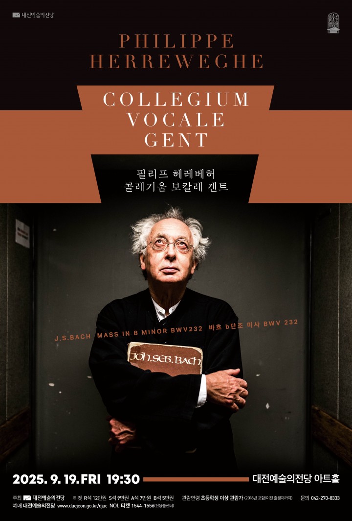 [대전타임뉴스=홍대인 기자] 대전예술의전당(관장 김덕규)은 세계적인 지휘자 필리프 헤레베허와 바로크 앙상블 콜레기움 보칼레 겐트가 오는 19일 아트홀에서 내한 공연을 연다고 12일 밝혔다. 이번 공연은 바흐 탄생 340주년을 기념해 마련됐으며, 2006년 이후 19년 만에 대전 무대에 다시 오르는 자리다. 프로그램은 바흐의 대표적 걸작 [b단조 미사]로, 웅장한 푸가와 섬세한 솔로, 극적인 합창이 어우러진 바로크 종교음악의 정수를 선보인다. 필리프 헤레베허는 의학을 전공하고 정신과 의사로 활동하다 지휘자의 길로 들어선 독특한 이력을 지녔다. 그는 음악을 인간의 정신적 언어로 해석하며 고음악 분야에서 독창적 해석을 확립해왔다. 특히 비브라토를 최소화하고 균일한 음색을 추구하는 그의 바흐 해석은 투명하고 정제된 음향으로 평가받는다. 그가 꼽은 감상 포인트는 제2부 ‘글로리아’의 ‘Qui sedes ad dexteram Patris’ 부분으로, 오보에와 알토가 긴밀히 호흡을 주고받는 대목을 가장 사랑한다고 전했다. 올해 창단 55주년을 맞은 콜레기움 보칼레 겐트는 유럽 바로크 음악을 대표하는 앙상블로, 오랜 호흡에서 비롯된 완벽한 합주와 뛰어난 음악성으로 바로크 음악의 이상적 모델로 꼽힌다. 이번 내한 공연은 관객들에게 유럽 고음악의 정수를 경험할 기회를 제공할 것으로 기대된다. 티켓은 R석 12만 원, S석 9만 원, A석 7만 원, B석 5만 원이며, 초등학생 이상 관람 가능하다. 자세한 내용은 대전예술의전당 홈페이지(www.daejeon.go.kr/djac)에서 확인하거나 전화(042-270-8333)로 문의할 수 있다.