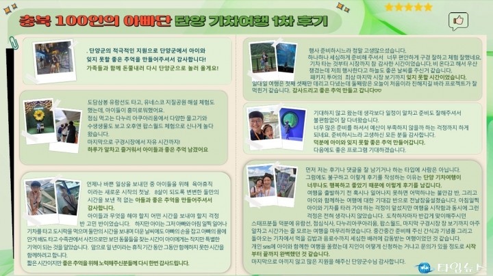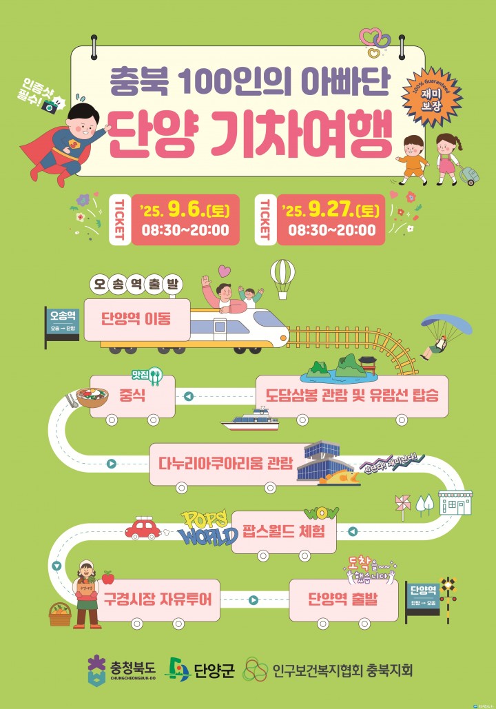 [충북타임뉴스=한정순 기자] 충북도는 오는 9월 27일(토) ‘100인의 아빠단’ 단양 기차여행 2차 프로그램을 운영한다고 밝혔다.