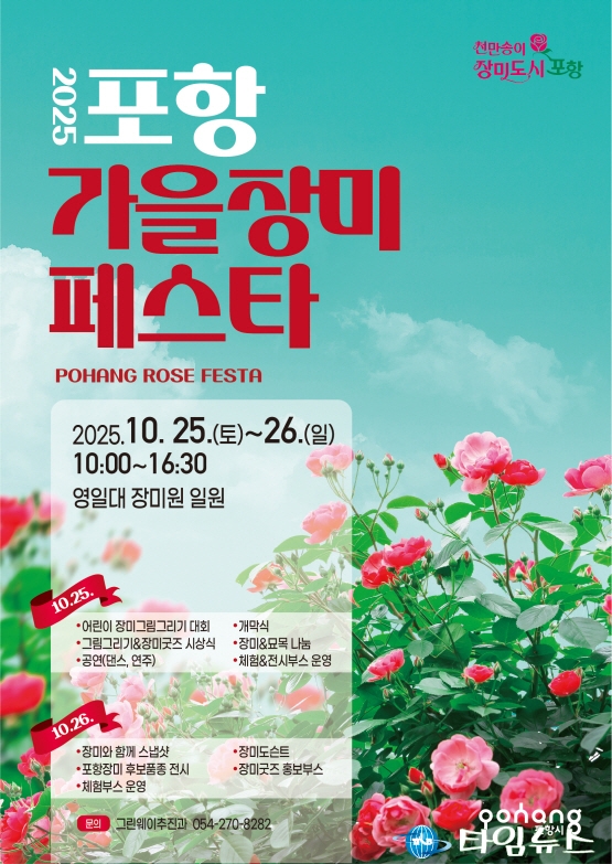 [포항타임뉴스=전찬익기자] 포항시는 오는 25일부터 26일까지 양일간 영일대장미원에서 ‘2025 포항 가을장미페스타’ 행사를 개최한다. 이번 행사는 가을의 낭만과 도심 속 자연을 함께 즐길 수 있는 시민 참여형 축제로, ‘바다와 장미의 만남’이라는 포항만의 독특한 매력을 느낄 수 있는 다채로운 프로그램이 펼쳐진다. 첫날인 25일에는 ‘어린이 장미그림그리기대회’를 시작으로 ▲개막식 ▲장미그림그리기 및 장미굿즈 시상식 ▲청소년동아리·지역예술단체 공연 ▲장미 묘목 나눔행사 등이 이어져 가족 단위 시민들이 함께 즐길 수 있는 축제의 장이 마련된다.어린이 장미그림그리기대회는 25일 행사 당일 현장에서 진행되며, 저학년(초1~3학년)과 고학년(초4~6학년) 각 50명씩 사전 신청을 받아 참여한다. 심사는 현장에서 외부 전문가 3명이 직접 평가하며, 최우수 2명·우수 4명·장려 4명·입선 10명 등 총 20명의 수상자를 선정한다. 지난달 열린 장미굿즈 디자인 공모전 수상자들과 함께 시상할 예정이다.사장에서는 ▲포항시 고유 품종(시화) 후보종 전시 ▲청소년·지역예술단체 공연 ▲다양한 체험·홍보 부스도 운영된다. 특히, 장미사랑회의 ‘바다장미축제’와 (사)경북생명의숲이 주관하는 ‘나무 나누어주기 행사’가 연계 개최돼 볼거리·즐길거리·참여 프로그램이 어우러진 종합 가을축제로 꾸며질 예정이다.둘째 날인 26일에도 장미 스냅샷 촬영, 장미 풍선 만들기, 장미해설 프로그램 등 장미를 주제로 한 체험형 콘텐츠가 이어져 가족 단위 관람객과 관광객들의 발길이 이어질 것으로 기대된다. 또한 포항의 대표 가을 관광 명소로 자리 잡은 영일대장미원이 도심 속 ‘가을 포토존’으로 주목받을 전망이다.신강수 푸른도시사업단장은 “봄 장미의 화려함과는 또 다른, 파란 가을하늘 아래에서 피어나는 가을장미의 매력을 국내 유일의 ‘바다 장미정원’ 영일대에서 즐기시기 바란다"며 “천만송이 장미도시 포항의 아름다움을 알리고, 도시 브랜드 가치를 높이기 위해 최선을 다하겠다"고 말했다.