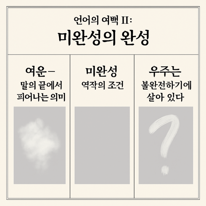 시간이 잠시 멈춘 하나의 단면에 불과하다.진정한 예술은 미완성으로 존재하며,그 불완전 속에서 무한히 이어지는 생명의 리듬을 품는다.우주는 불완전하기에 살아 있다우주는 완성되지 않는다.완성된 우주는 정지된 우주이며,정지란 곧 죽음이다.별은 태어나고 사라지고,질서는 무질서 속에서 생겨난다.이것이 엔트로피의 역설이며,혼돈이 창조의 원동력이 되는 이유다.인간의 의식도 마찬가지다.완전한 지식은 존재하지 않는다.우리는 언제나 불완전한 이해 속에서 진리를 추적하는 존재다.그 끝없는 추구가 인간을 인간이게 만든다.완성의 끝, 미완의 시작“완성은 닫힘이고, 미완성은 열린 문이다."여백은 언어의 틈이고,미완성은 시간의 틈이다.그 틈이 존재하기에우리는 다시 사유하고, 다시 창조할 수 있다.말이 멈출 때 여운이 남고,여운이 남을 때 사유가 시작된다.결국 모든 예술과 철학, 그리고 인간의 생은미완성으로 완성되는 여정이다.