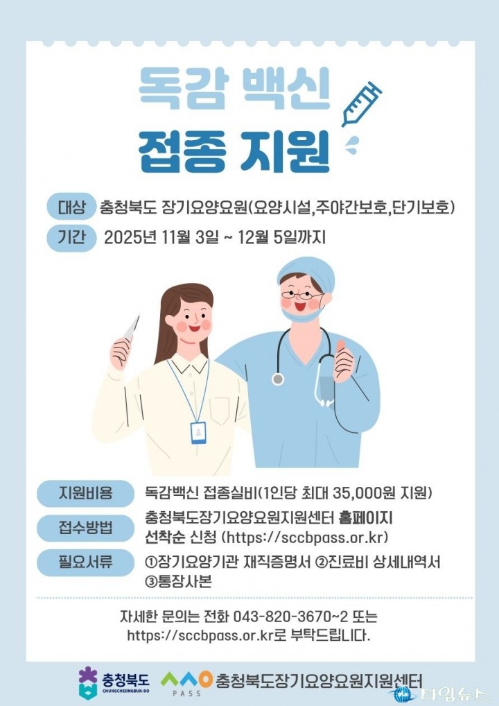 【충북타임뉴스=한정순 기자】 충청북도와 충청북도 장기요양요원지원센터(센터장 신경희)는 도내 장기요양요원의 건강 보호와 감염병 예방을 위해 ‘장기요양요원 독감백신 접종 지원사업’을 처음으로 시행한다고 밝혔다.