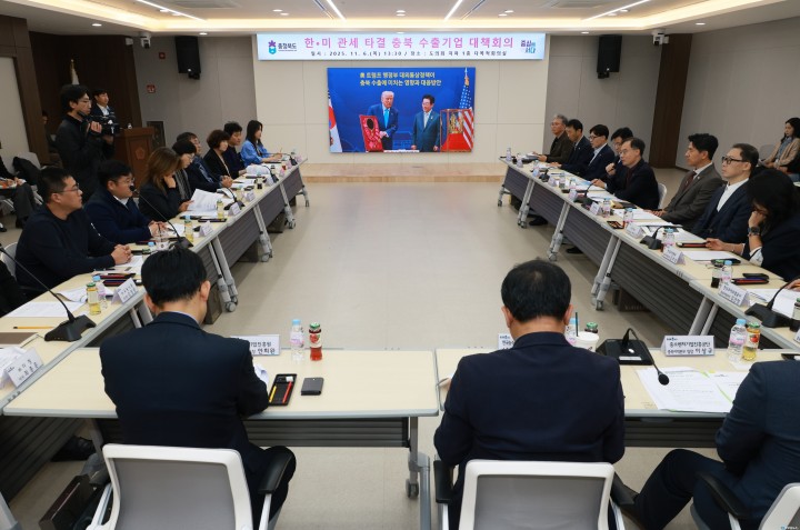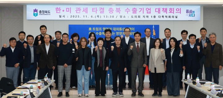 【충북타임뉴스=한정순 기자】충청북도는 11월 6일(목) 오후 1시 30분, 충북도의회 다목적회의실에서 KOTRA 충북지원본부, 한국무역협회 충북지역본부 등 7개 수출 유관기관, 충북연구원, 그리고 미국 수출기업 10개사와 함께 ‘韓-美 관세 협상 타결에 따른 충북 수출기업 대책 회의’를 열고 타결 영향 분석 및 대응 전략 마련에 나섰다.