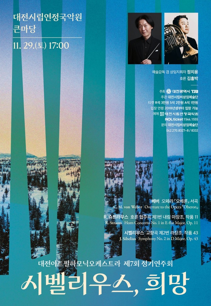 [대전타임뉴스=홍대인 기자] 대전아트필하모닉오케스트라가 29일 오후 5시 대전시립연정국악원 큰마당에서 제7회 정기연주회를 연다. 이번 공연은 정치용 예술감독 겸 상임지휘자가 지휘봉을 잡고 세계 무대에서 활약해 온 호르니스트 김홍박이 협연자로 나서며 대전아트필의 연말 무대를 더욱 풍성하게 만든다. 대전아트필은 이번 정기연주회를 통해 낭만주의와 북유럽 음악의 정수를 전하고 지역 클래식 무대를 넓히는 기회를 마련했다. 공연은 베버 오페라 오베론 서곡으로 문을 연다. 호른의 청아한 음색과 현악기의 신비로운 선율이 어우러져 베버 특유의 환상적 분위기를 극적으로 구현한다. 이어지는 무대는 김홍박이 협연하는 리하르트 슈트라우스 호른 협주곡 제1번이다. 젊은 슈트라우스의 대담한 화성과 호른의 영웅적 음색이 응축된 작품으로, 당당한 1악장과 서정적 2악장, 고난도 기교가 요구되는 3악장이 연주되는 구성이 특징이다. 협연자 김홍박은 서울대학교와 모차르테움, 베를린 국립음대에서 수학했으며 동아음악콩쿠르와 일본 관타악 국제 콩쿠르에서 입상한 바 있다. 그는 오슬로필하모닉과 KBS교향악단 등 다수의 무대에서 활약했고 서울시향 부수석과 스웨덴 왕립오페라 제2수석, 오슬로필하모닉 호른 수석을 역임했으며 현재 서울대학교 교수로 활동 중이다. 대전아트필은 김홍박의 참여로 이번 무대가 한층 깊이 있는 해석을 보여줄 것으로 기대하고 있다. 공연의 마지막 무대는 시벨리우스 교향곡 제2번이다. 북유럽 특유의 서정성과 광활한 선율, 마지막 악장에서 폭발하는 승화의 정서가 압도적인 울림을 전하는 작품이다. 정치용 지휘자의 견고한 해석과 대전아트필의 응집력 있는 사운드는 교향곡이 지닌 장대한 스케일을 설득력 있게 전달할 전망이다. 대전아트필은 꾸준한 성장과 탄탄한 기량을 기반으로 지역 음악문화의 폭을 넓히며 전문 예술단체로 자리매김하고 있다. 자세한 연주회 정보는 예매처 홈페이지에서 확인하거나 대전시립비상임예술단으로 문의할 수 있다.
