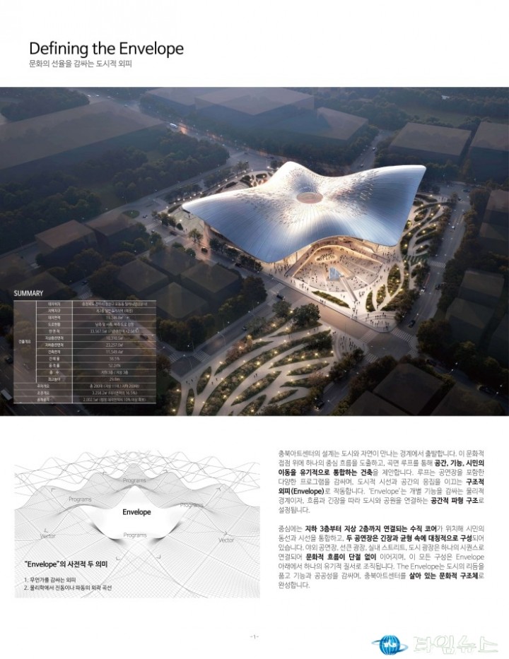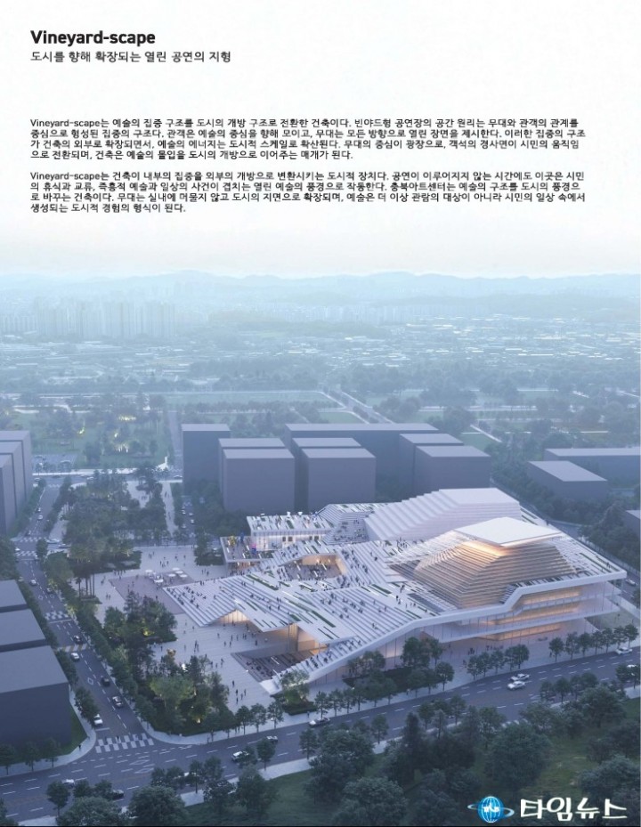 충북도가 처음으로 시행한 이번 국제공모에는 15개국에서 총 33개 작품이 출품되는 등 국내외 건축계의 높은 관심이 집중됐다. 충북아트센터 운영위원회를 중심으로 한 심사위원회는 공정하고 전문적인 평가를 거쳐 최종 5개 작품을 당선작으로 선정했다.