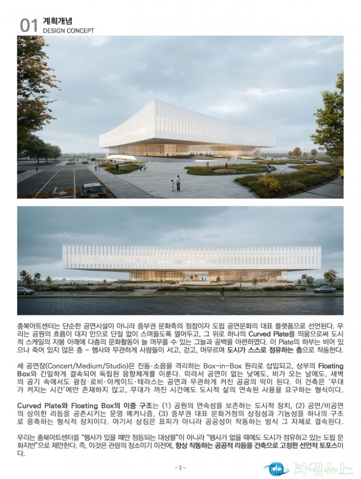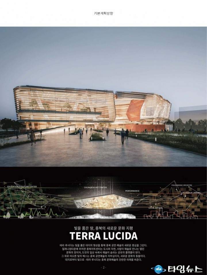 [충북타임뉴스=한정순 기자] 충청북도가 충북아트센터 건립의 본격적인 추진을 알리는 ‘충북아트센터 기획디자인 국제공모 공개포럼’을 11일 도청 대회의실에서 개최했다. 이번 포럼은 올해 6월부터 10월까지 진행된 국제 설계공모를 통해 선정된 5개 당선작을 도민에게 처음으로 공개하고, 사업 추진 현황과 향후 계획을 공유하기 위해 마련됐다.