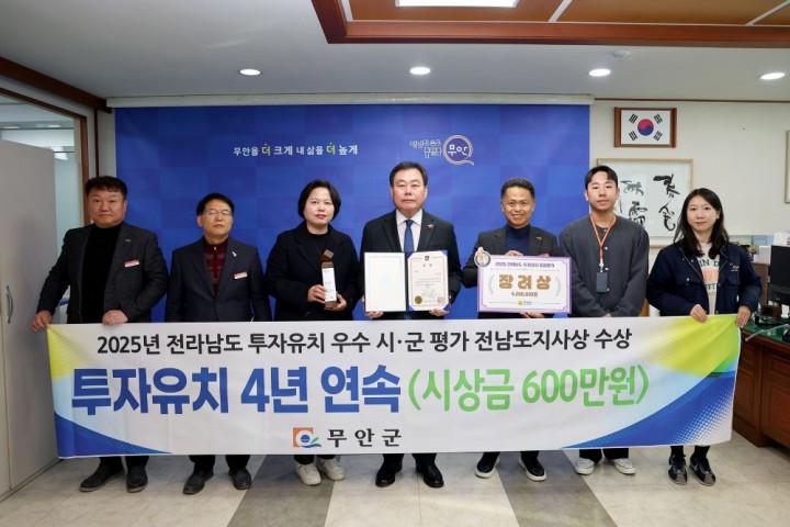 [무안타임뉴스=오현미 기자] 전남 무안군은 2025년 일자리경제 한마당 행사에서 투자유치 분야 우수 시군으로 선정돼 도지사 표창을 수상했다고 26일 밝혔다. 이로써 무안군은 4년 연속 입상이라는 성과를 거두며 투자유치 분야에서 꾸준한 경쟁력을 보여주고 있다.