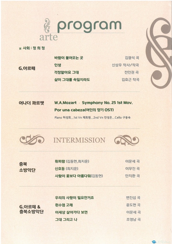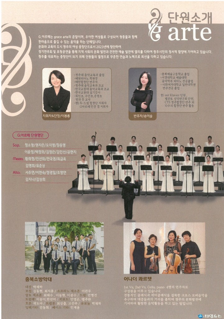 특별출연으로 무대에 오른 충북소방단은 힘 있고 안정적인 화음으로 관객들에게 깊은 울림을 선사했으며, 어나더 콰르텟은 모차르트 교향곡과 영화 OST 등을 선보이며 공연에 다채로운 색감을 더했다. 성악과 실내악, 합창이 유기적으로 어우러진 프로그램 구성은 G.아르떼가 추구하는 ‘음악을 통한 공감과 소통’의 가치를 잘 보여줬다는 평가다.