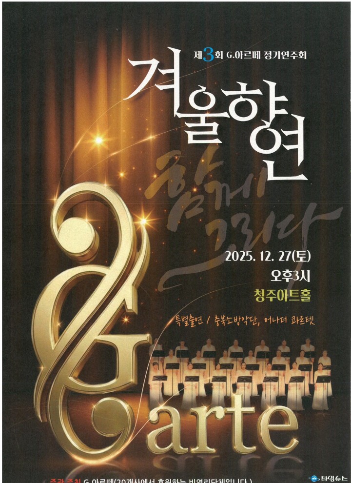 [충북타임뉴스=한정순 기자] 청주 겨울의 끝자락을 따뜻하게 물들인 합창과 실내악의 향연이 시민들의 큰 호응 속에 막을 내렸다. 제3회 G.아르떼 정기연주회 ‘겨울향연’이 지난 12월 27일 오후 3시, 청주아트홀에서 성황리에 개최됐다.