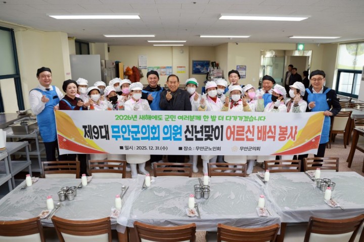[무안타임뉴스=오현미 기자] 전남 무안군의회는 연말 종무식을 대신해 31일 무안군노인회 경로식당에서 어르신들을 위한 점심 배식 봉사활동을 진행하며 한 해의 끝자락을 따뜻한 나눔으로 마무리했다.