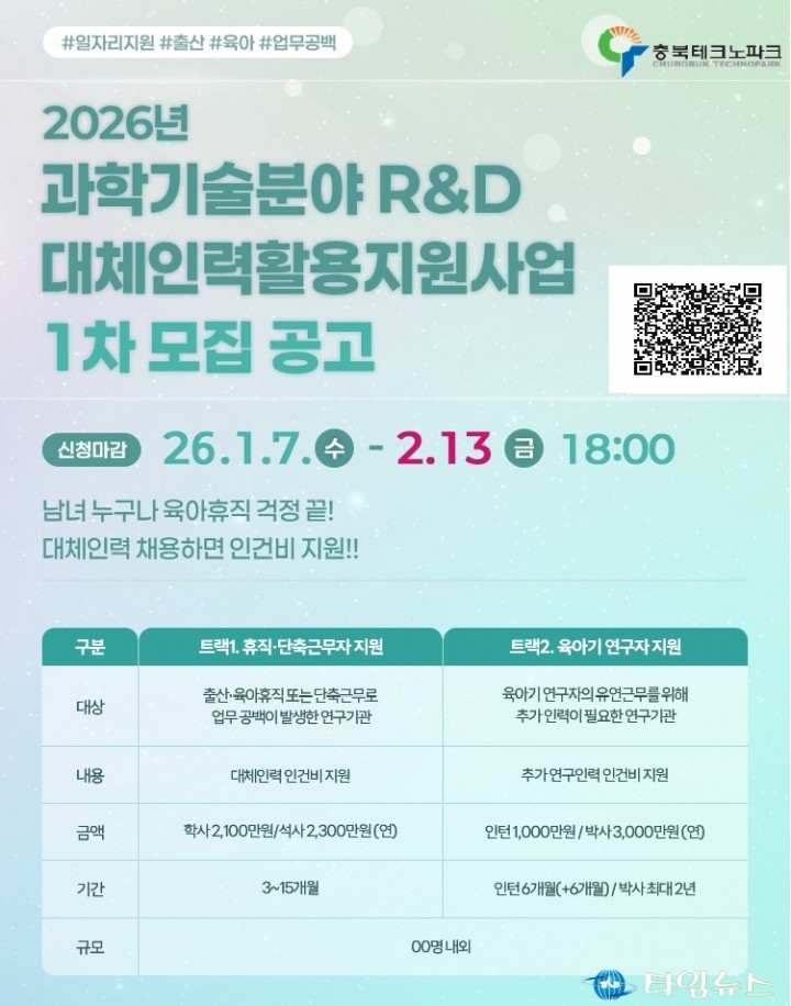 [충북타임뉴스=한정순 기자] 충북테크노파크가 한국여성과학기술인육성재단과의 협약을 통해 ‘2026년 과학기술분야 R&D 대체인력 활용 지원사업’ 1차 모집을 오는 2월 13일까지 진행한다고 밝혔다.