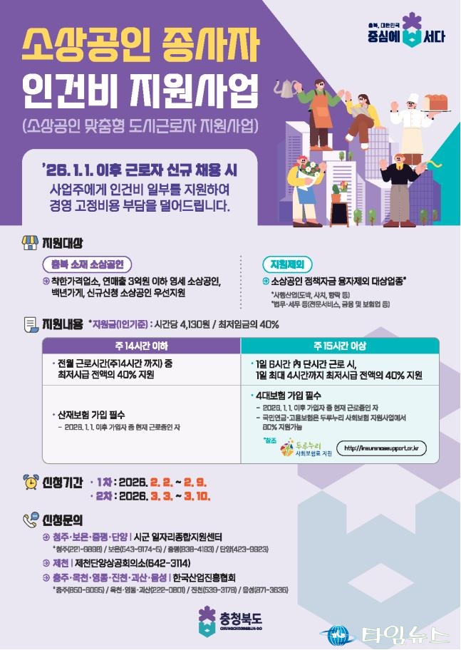 [충북타임뉴스=한정순 기자] 충청북도가 도내 기업과 소상공인의 고질적인 인력난을 해소하고, 유휴 인력의 경제활동 참여를 확대하기 위한 ‘2026년 충북형 도시근로자 지원사업’을 2월부터 본격 추진한다.