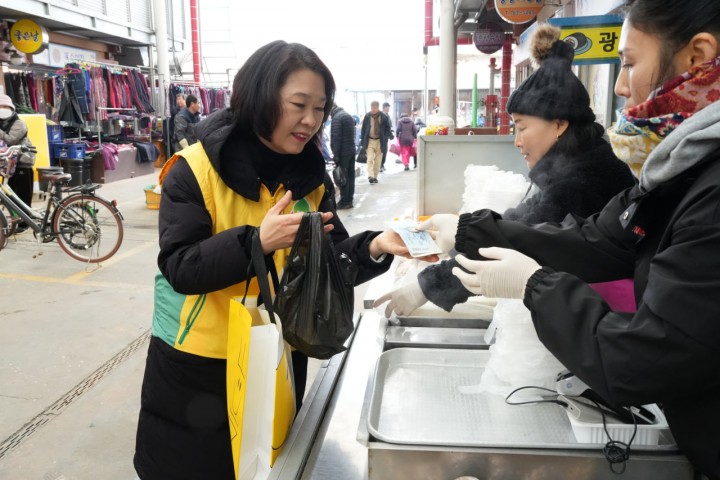 [광양타임뉴스=오현미 기자] “경기가 안 좋고 날이 추워서 다들 대형마트로 가니 전통시장이 힘든데, 이렇게 관심 가져 주고 장보기 행사를 해주시니 장사하는 데 힘이 돼요. 올해는 사람들이 행복하고 즐거운 일들만 있었으면 하는 바람이에요."