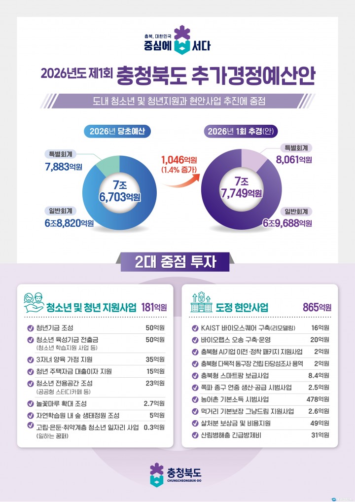 충북도는 3일 도민 체감형 사업과 상반기 추진이 시급한 현안사업을 중심으로 한 2026년도 제1회 추가경정예산안을 편성해 도의회에 제출했다고 밝혔다. 이에 따라 충북도 총예산 규모는 당초예산 7조 6,703억 원보다 1.4% 증가한 7조 7,749억 원으로 확대됐다. 이 가운데 일반회계는 6조 9,688억 원, 특별회계는 8,061억 원이다.