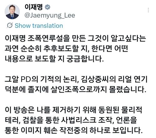 이 대통령은 끝으로 “정치적 목적으로 조작 폭로를 일삼은 세력과 이를 확산시킨 방송사의 진심 어린 반성이 필요하다”며, “미안하다는 진솔한 사과 한마디를 듣고 싶다”고 덧붙였다.